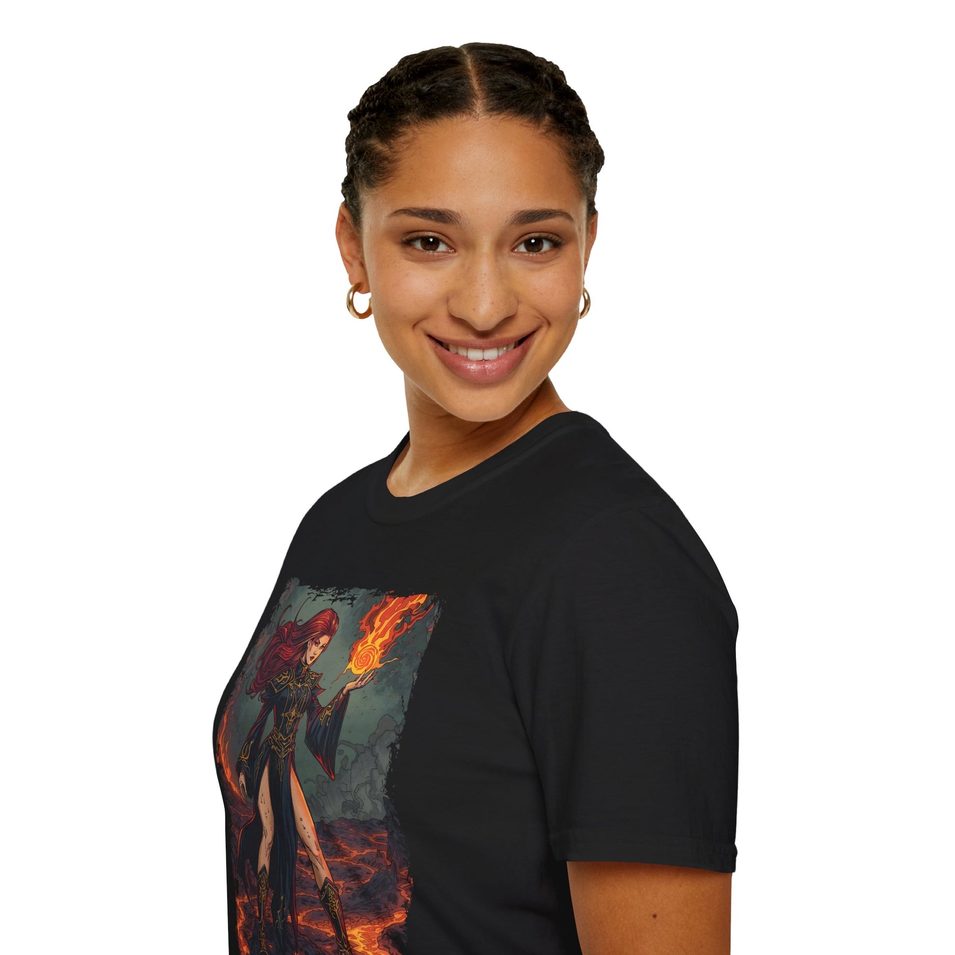 The Ember Sorceress of the Ashlands T-Shirt – 80s Dark Fantasy Fire Mage Illustration